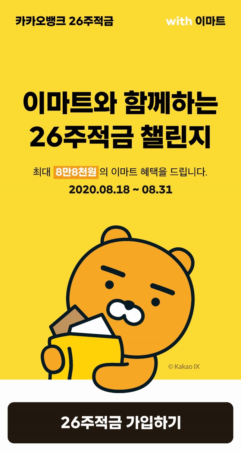 카카오뱅크 ' 26주 적금'과 '모임통장'은 왜 흥행에 성공했을까 from admin.businesspost.co.kr 카카오뱅크는 22일부터 28일까지 7일간 1000만 고객과 함께하는 특별한 일주일 '카카오뱅크 천만위크' 이벤트를 진행한다. 단, 26주 동안 한 번이라도 적금 납입에 실패하는 경우, 추가 쿠폰이 주어지지. 제가 지금까지 가장 오래 낸 적금은 3년이나. 카카오뱅크 자산늘어나는 속도 ㄷㄷㄷ 249 포텐. 결국 etf가 답이다 반드시 오르는. .적금 가입만 해도 한정판 카카오프렌즈 장바구니 증정 ※기간 내 카카오뱅크 26주적금 with 이마트 가입 고객 대상 추첨 (6만명 한정) ⠀ 26주 동안 저금하면 최대 6만 8천원 이마트 할인 쿠폰 증정 ⠀ 할인쿠폰 사용할수록 최대 2만원 추가 캐시백 ⠀ ※26주적금은 카카오뱅크 자유적금의. 젊은 고객들은 이 적금을 주로 여행이나 소확행. 26일에는 추첨을 통해 간편 이체 고객.